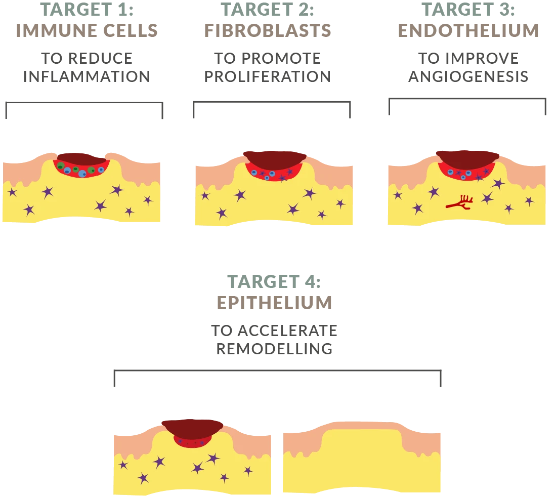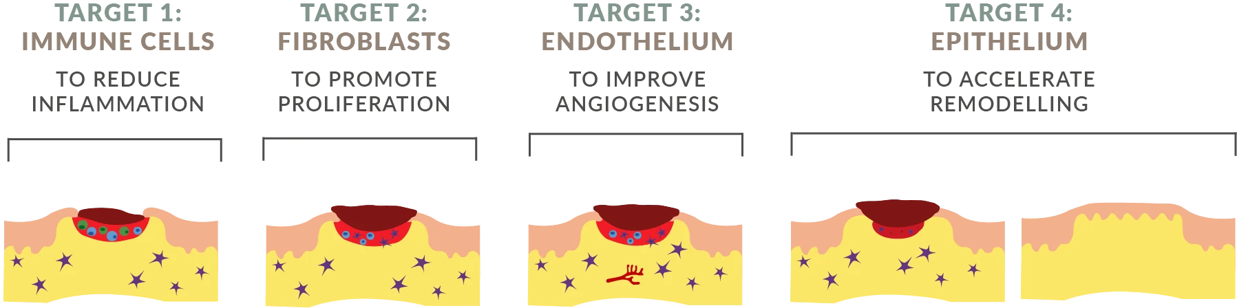 The continuous production of the three therapeutic proteins FGF-2, IL-4 and CSF-1 by the active vector lactococcus lactis at the site of the wound, results in our unique 4-in-1 combination biological treatment which is provided as one API.